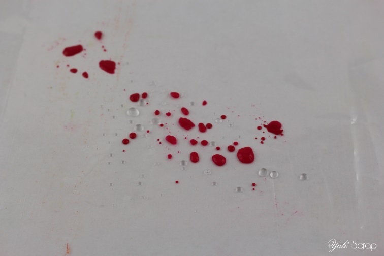 - Projeter, à l'aide du pinceau fin, quelques gouttes d'encre liquide colorée.